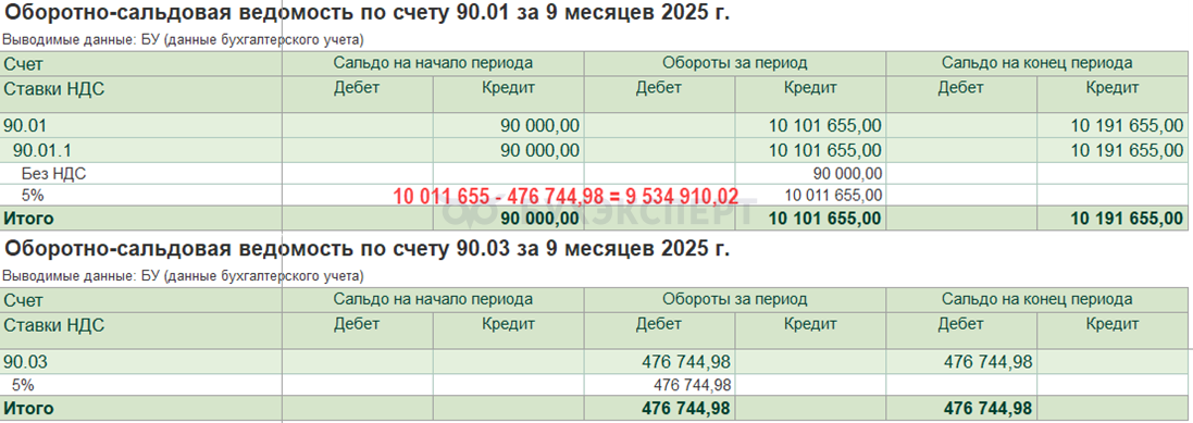 - Кт 90.01.1 минус Дт 90.03 — по номенклатурным группам или ставкам НДС
