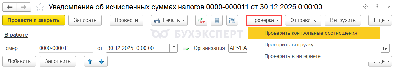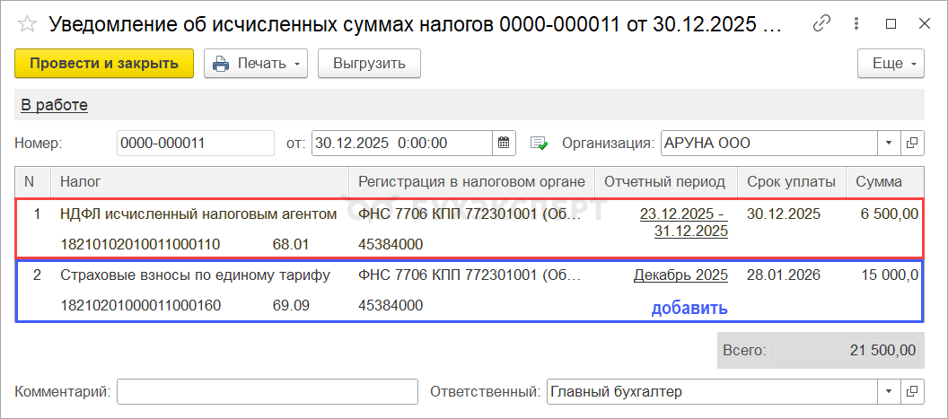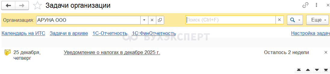 Сформируйте Уведомление об исчисленных суммах налогов из раздела Главное – Задачи организации (или Отчеты — Календарь отчетности).