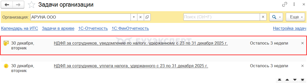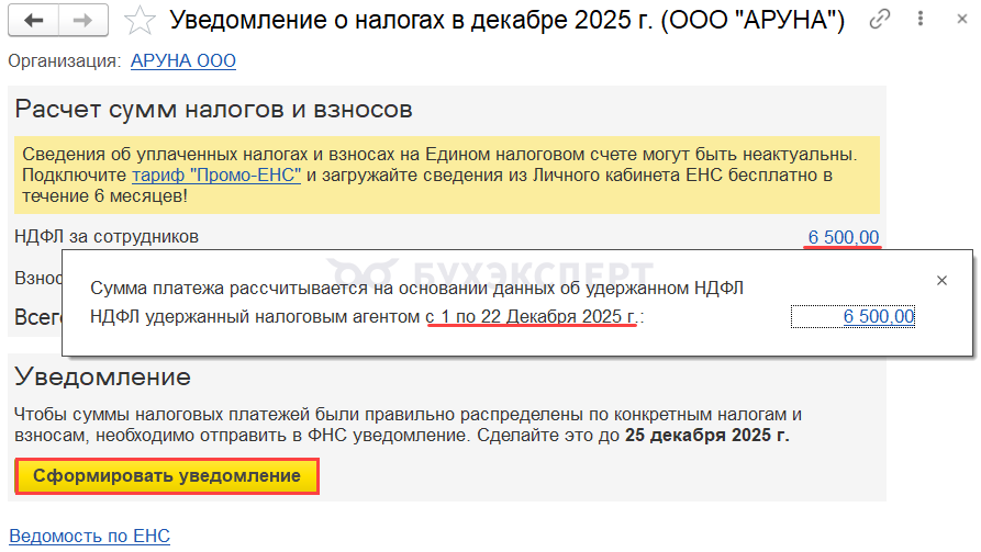 - НДФЛ, удержанному за период с 23 по 31 декабря, — обязательно не позже 30.12.2025 (последний рабочий день). Подробнее — Уведомление по ЕНП об исчисленном НДФЛ в 1С