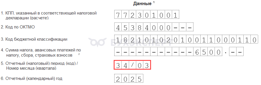 - Отчетный (налоговый) период (код) / Номер месяца (квартала) — 34/03