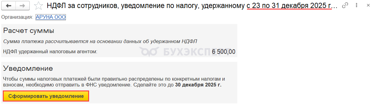 Если дата уведомления с 23 по 31 декабря и есть удержанный налог, уведомление заполняется автоматически, в графе Отчетный период проставляется: