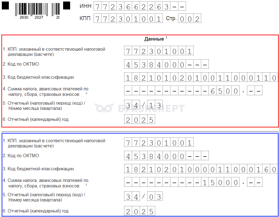 - страховые взносы за декабрь (с кодом 34/03) — укажите в одном уведомлении с НДФЛ по сроку с 23 по 31 декабря 2025 (с кодом 34/13)