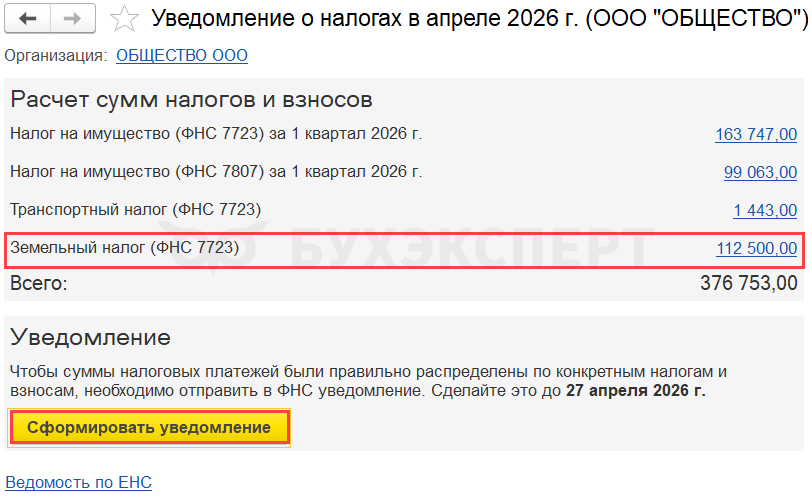 Если в 1С начислен налог, уведомление заполнится автоматически по всем налогам с единым сроком уплаты.