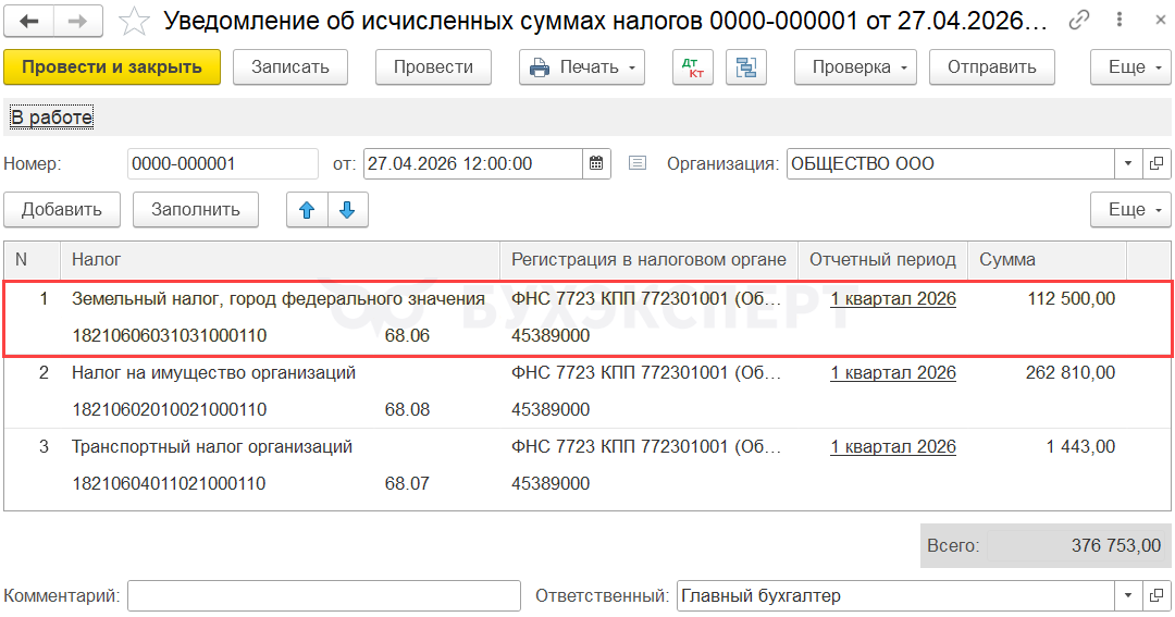 Формирование уведомления по земельному налогу за 1 квартал 2026 в 1С