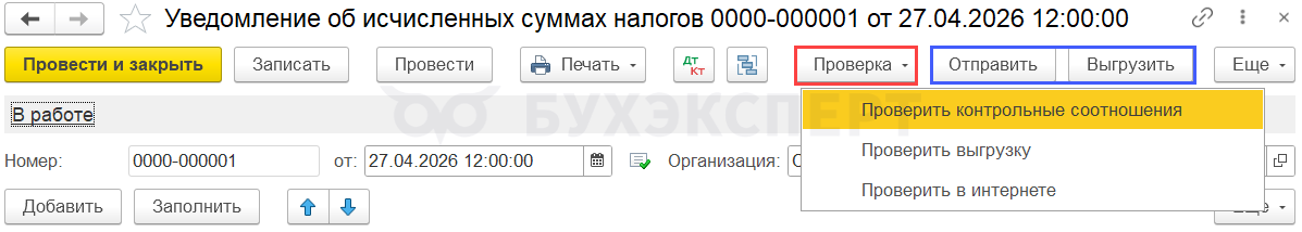 Уведомление об исчисленных суммах налогов отправьте в ИФНС по кнопке Отправить. Или выгрузите для отправки через стороннего оператора.
