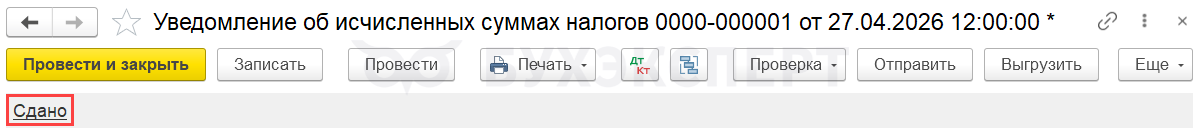 Сформируйте Уведомление об исчисленных суммах налогов из раздела Главное – Задачи организации (Отчеты — Календарь отчетности или Операции — Уведомления).