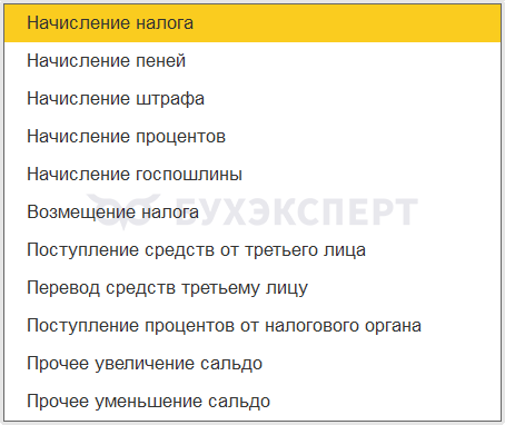 Вид операции Начисление налога используется для переноса обязанности по конкретному налогу на счет 68.90 «Единый налоговый счет», если эта обязанность не переносится автоматически (либо для корректировок автоматических начислений, уточненок).