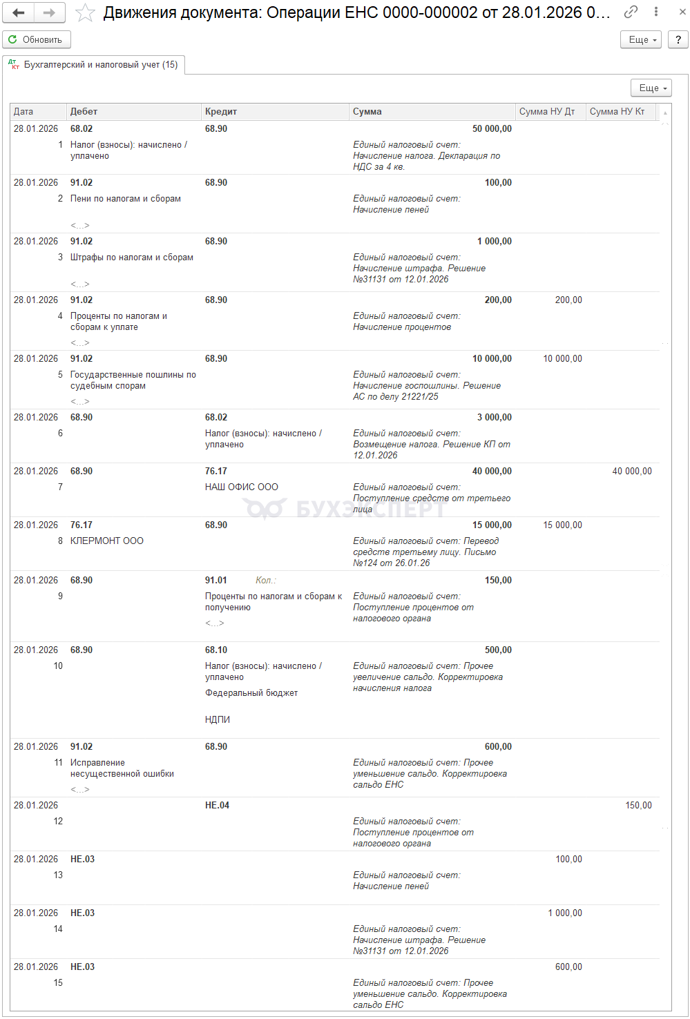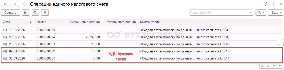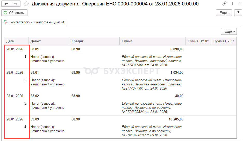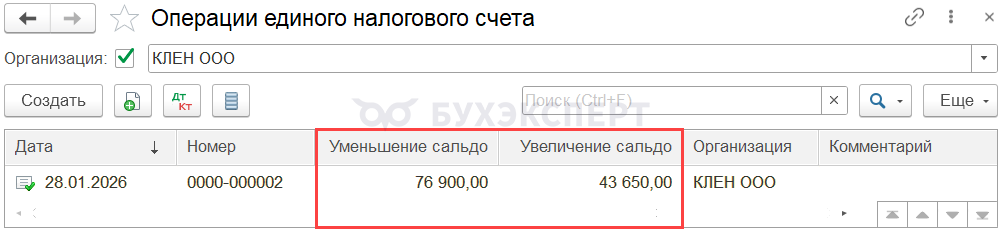 В журнале Операции единого налогового счета отражаются движения по операциям на ЕНС.