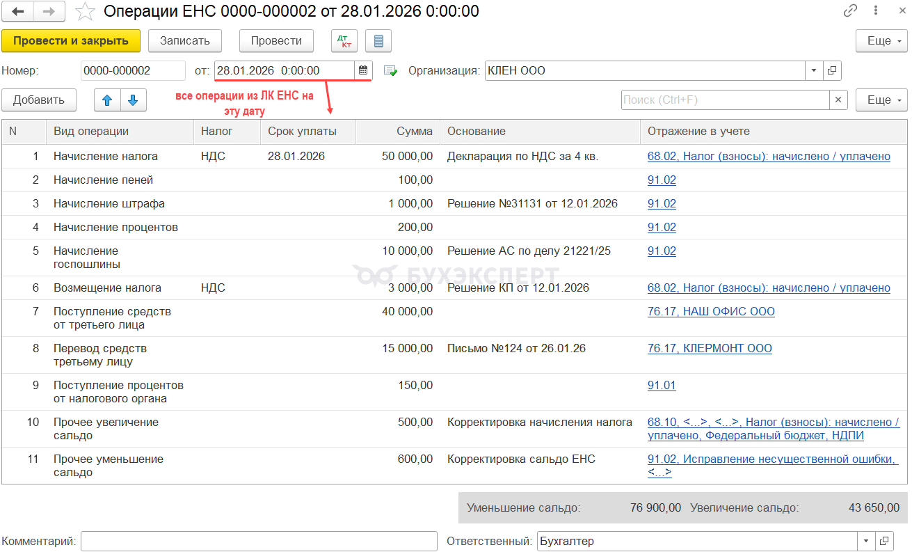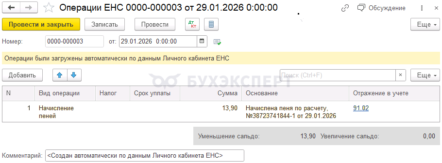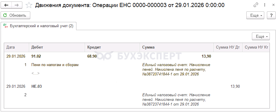 Начисленные налоговой пени и штрафы отражаются при каждом обновлении ЛК ЕНС — один документ Операции ЕНС на каждую дату начисления.