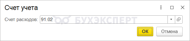 - Отражение в учете — автоматически устанавливается Счет расходов 91.02, при необходимости измените вручную