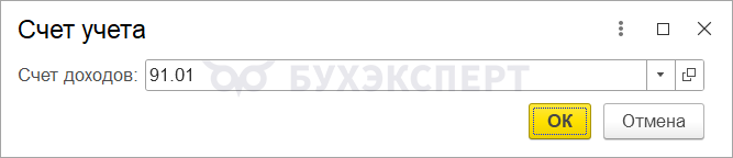 - Отражение в учете — автоматически устанавливается Счет доходов 91.01, при необходимости измените вручную