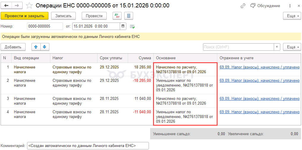 Если ранее начисление уже отражено на основании уведомления, при сдаче отчетности начисление не задваивается, создается «нулевой» документ Операции ЕНС.
