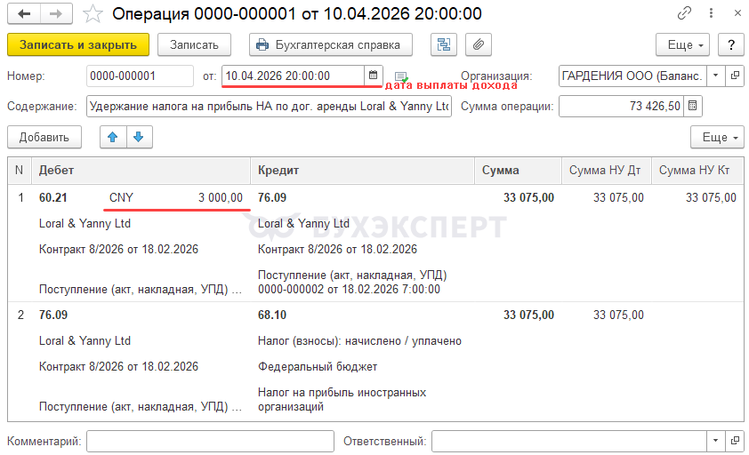 10 апреля Организация перечислила оплату в размере 9 000 CNY за вычетом удержанного налога на прибыль (25%).