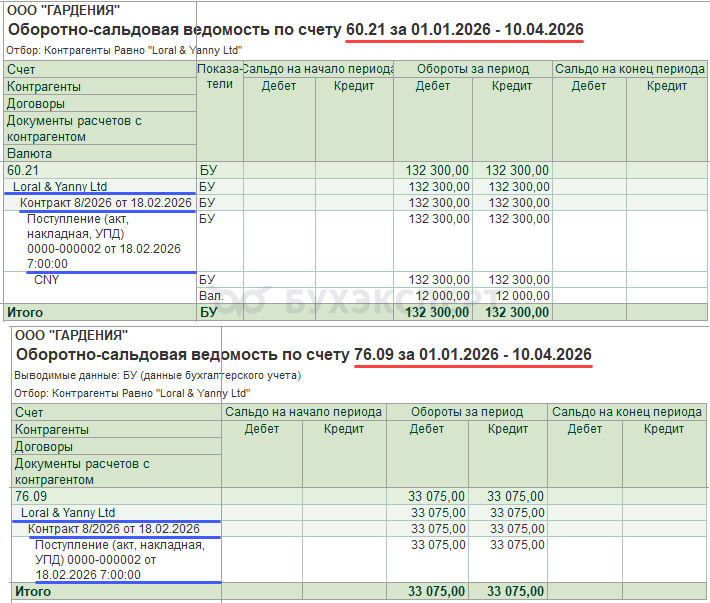 Обратите внимание на указание аналитики в проводках для счетов (60.21, 76.09) в проводках. Каждое субконто заполните, чтобы не создавать остатков по счетам в разрезе аналитики: