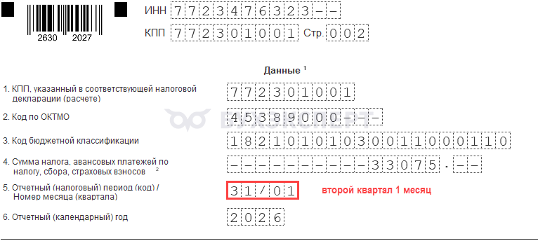 - Отчетный (налоговый) период — указываются коды для месячных платежей