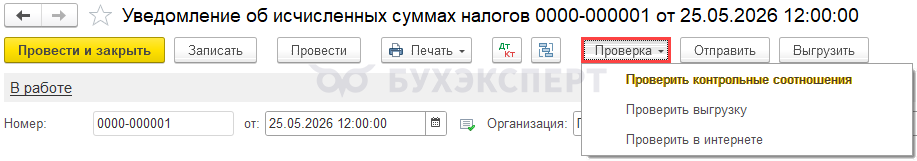 Перед отправкой уведомления сделайте проверку контрольных соотношений (Приказ ФНС от 16.01.2024 N ЕД-7-15/19@) в Уведомлении об исчисленных суммах налогов по кнопке Проверка