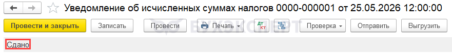 Уведомление об исчисленных суммах налогов отправьте в ИФНС по кнопке Отправить или выгрузите для отправки через стороннего оператора.
