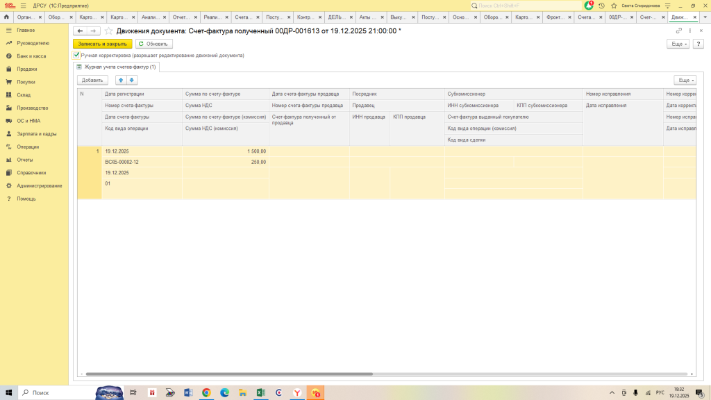 Шаг 3. Перейдите в проводки документа Счет-фактуру полученный и установите флажок Ручная корректировка (разрешает редактирование движений документа).