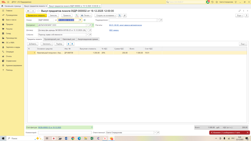 Шаг 1. Проведите документ Выкуп предметов лизинга в обычном порядке, зарегистрируйте входящий счет-фактуру.