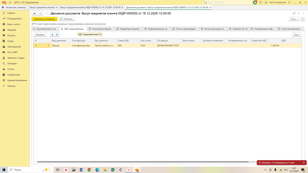 Подскажите, пожалуйста, документ Выкуп предмета лизинга как заполнен. Там есть % НДС 20% в табличной части?