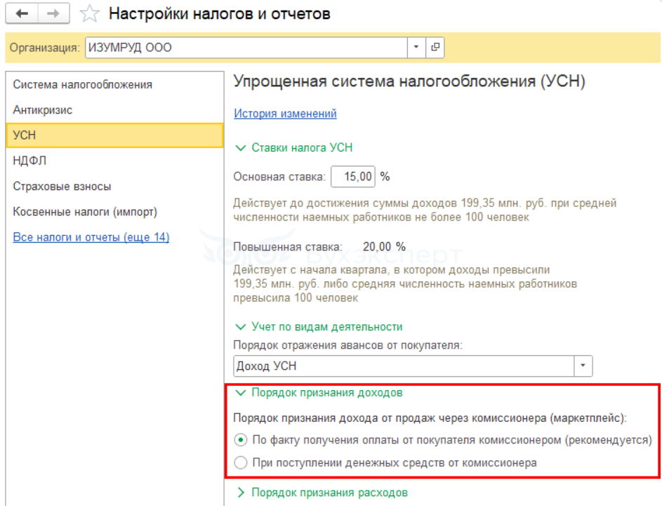 В 1С:Бухгалтерия возможны два варианта отражения доходов комитентом в разделе Главное — Налоги и отчеты — УСН (с релиза 3.0.164.23).