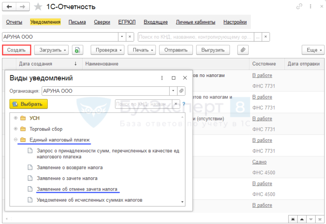 В 1С:Бухгалтерия создать Заявление о зачете налога и Заявление об отмене зачете налога из раздела Отчеты — Уведомления, сообщения, заявления — папка Единый налоговый платеж или Налоговый контроль — кнопка Выбрать.