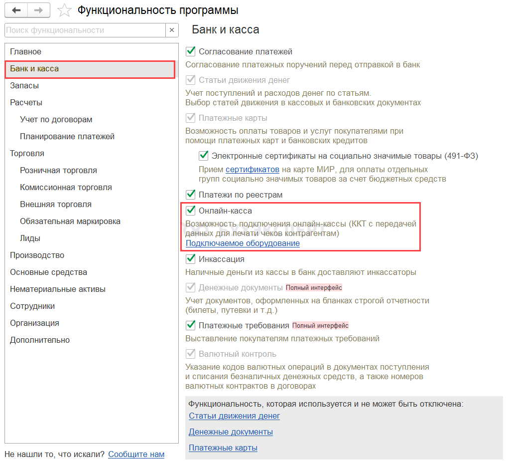 В 1С:Бухгалтерия подключить ККТ «с передачей данных» для печати кассовых чеков позволяет установка флажка Онлайн-касса в разделе Главное – Настройки –Функциональность – Банк и Касса.