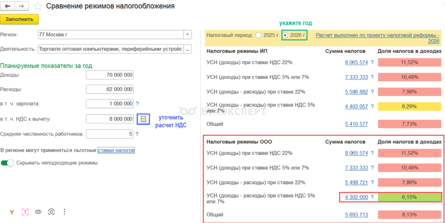 В 1С:Бухгалтерия для сравнения налоговой нагрузки с учетом разных ставок НДС в 2026 году можно использовать сервис Сравнение режимов налогообложения в разделе Руководителю.