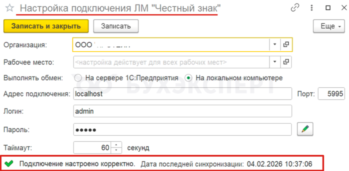 В 1С:Бухгалтерия предварительно проверьте настройку подключения 1С Бухгалтерия 8.3 к локальному модулю Честного знака. Для этого перейдите Администрирование – Настройки программы – Интеграция с ИС МП (обувь, одежда, табак…) – Параметры подключения к ЛМ ЧЗ. Удостоверьтесь, что подключение настроено корректно.