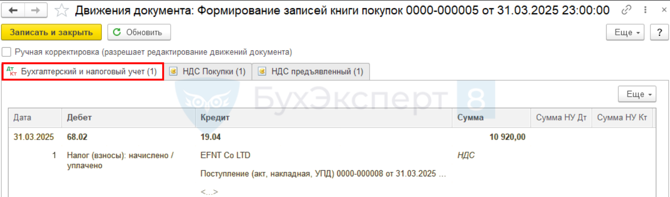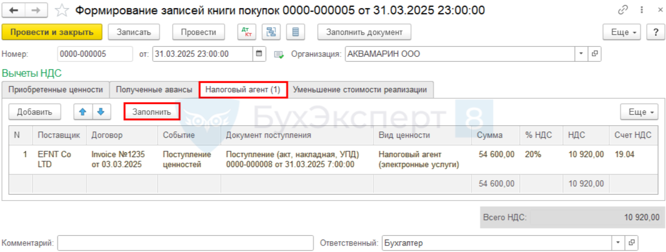 В 1С:Бухгалтерия принятие НДС к вычету оформляется документом Формирование записей книги покупок в разделе Операции — Регламентные операции НДС — кнопка Создать.