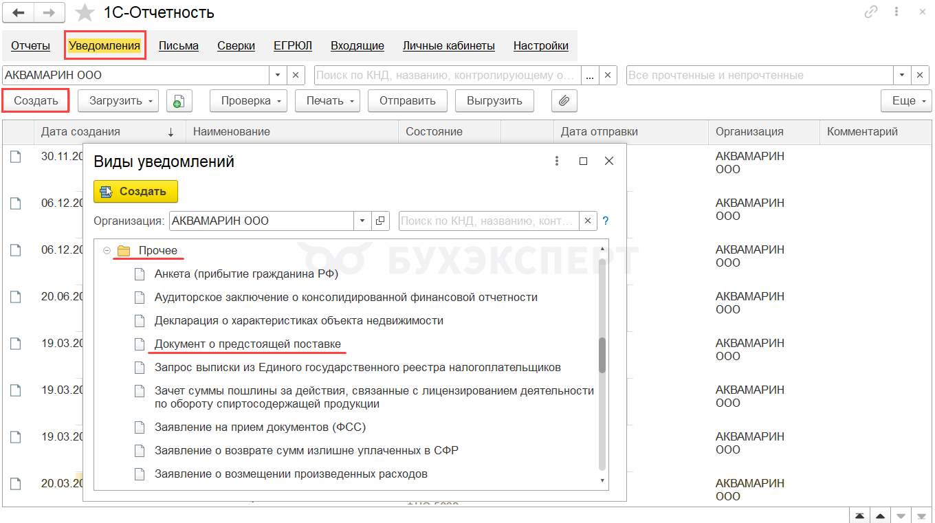 Создать и заполнить ДОПП можно в разделе Отчеты — 1С-Отчетность — Уведомления, сообщения, заявления — папка Прочее — Документ о предстоящей поставке.