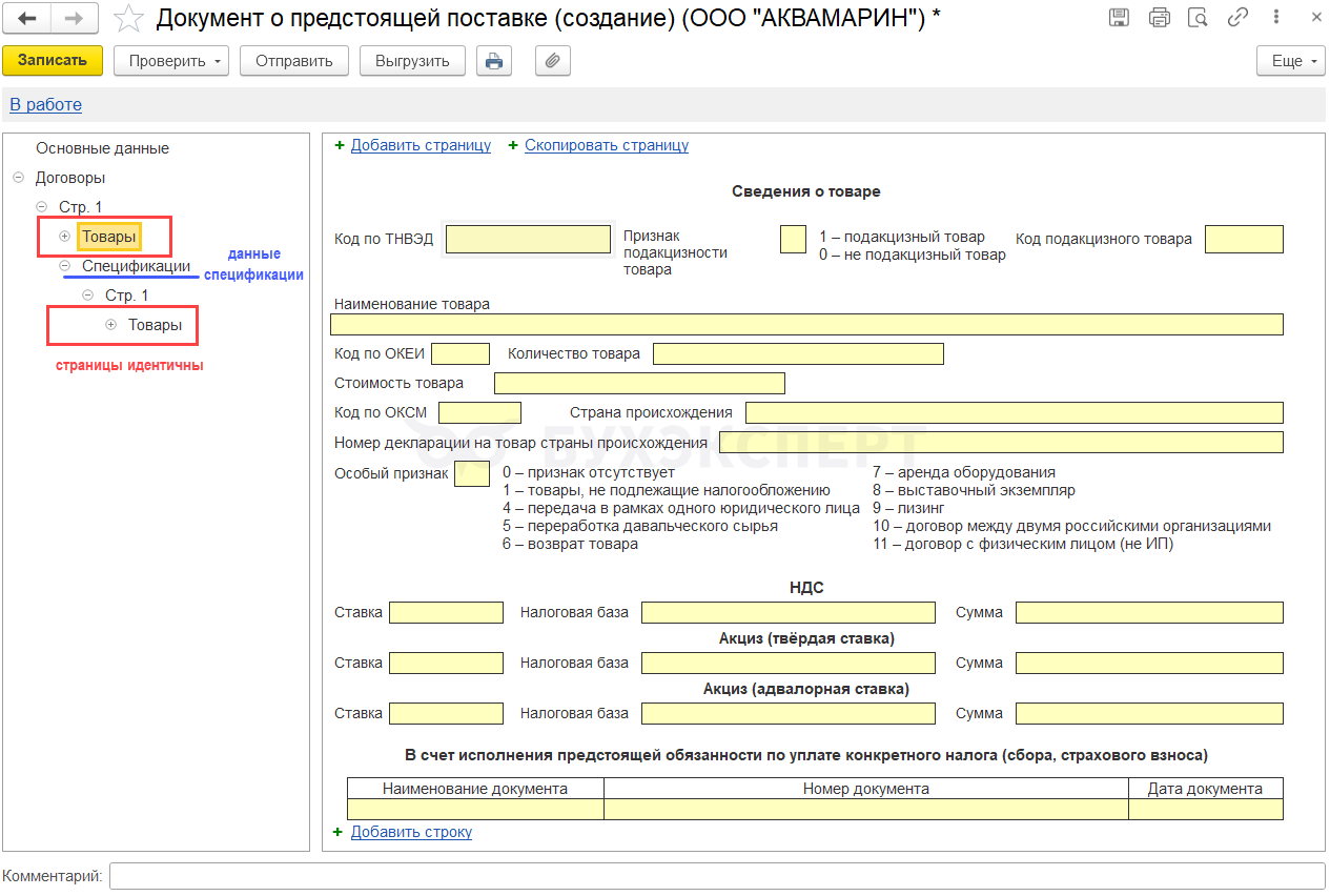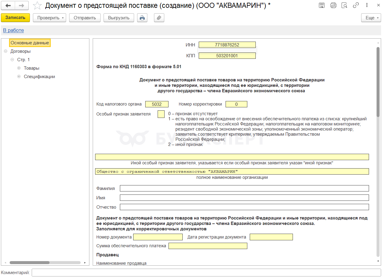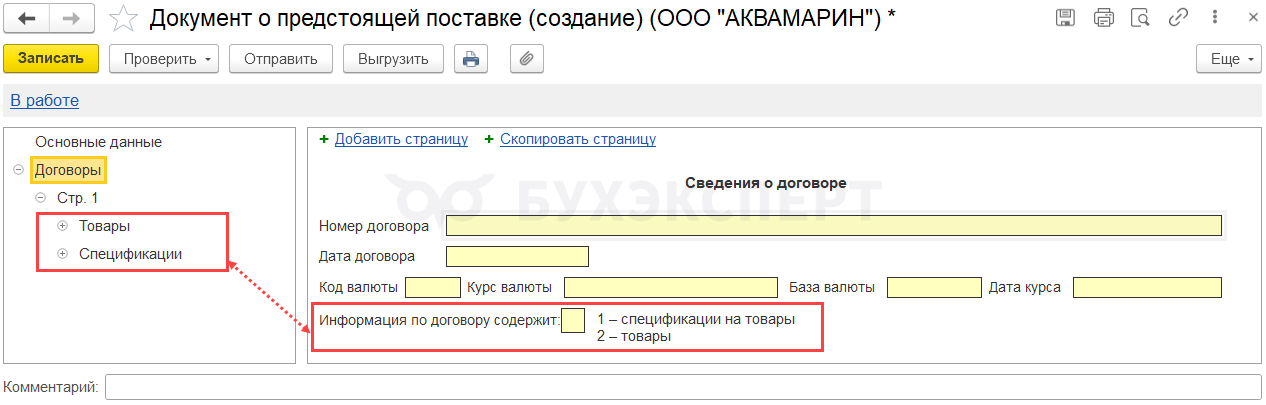 На странице Договоры укажите код, в зависимости от него заполните либо раздел Товары, либо Спецификации.