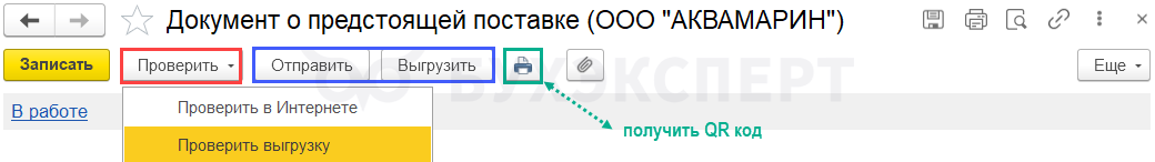 При отправке из 1С (через 1С-Отчетность) после изменения статуса на Зарегистрировано, обеспечено можно будет получить QR-код и передать его перевозчику.