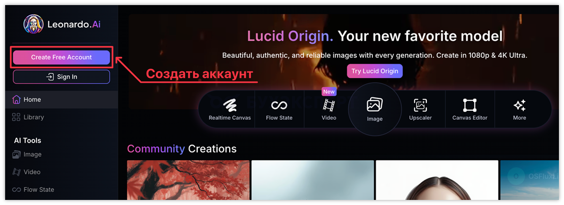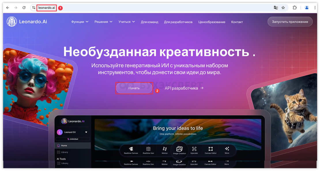 Перейдите по ссылке https://leonardo.ai/ и нажмите Начать.