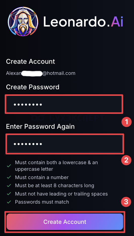 Введите пароль и подтверждение пароля. Нажмите кнопку Create Account.