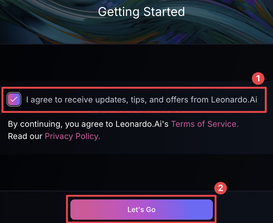 Примите условия согласия условий работы с Leonardo и нажмите кнопку Let`s Go.