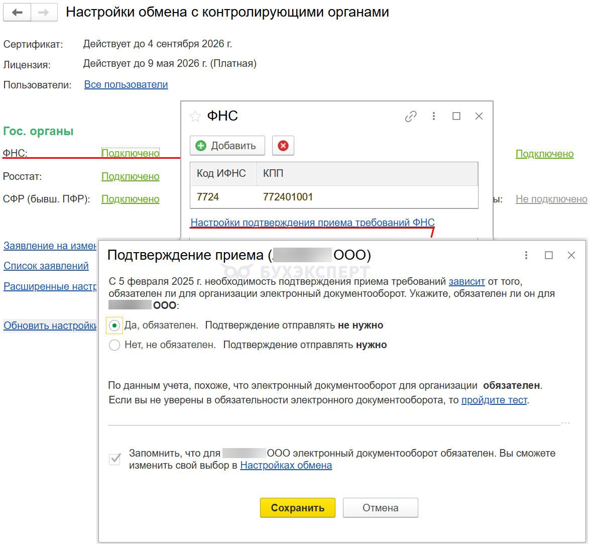 Изменить необходимость подтверждения приема требований можно в настройках сервиса 1С:Отчетность.