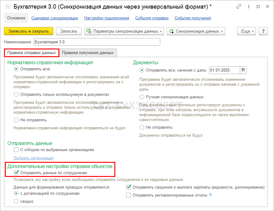 - установите флажок Отправлять данные по сотрудникам в настройках обмена на стороне 1С: ЗУП.