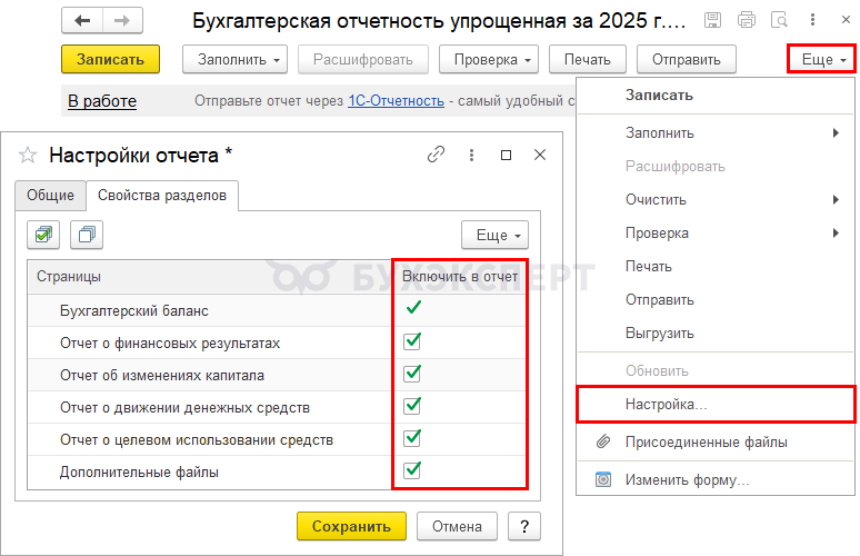 Для добавления отчетов в БФО перейдите по кнопке Еще — Настройка — вкладка Свойства разделов и установите флажки напротив сдаваемых форм отчетов.