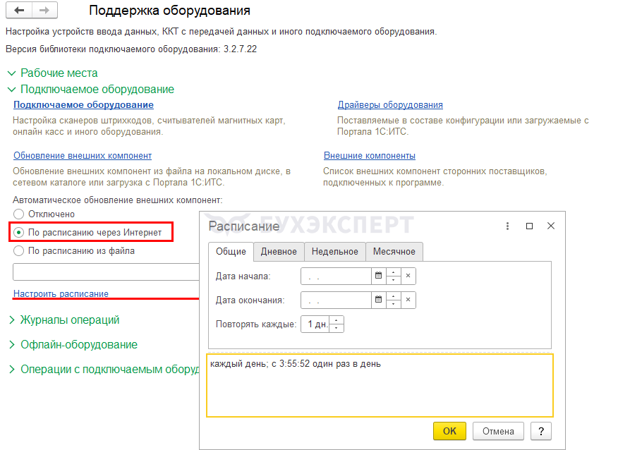 Для автоматической загрузки и обновления драйверов ККТ перейдите в раздел Администрирование — Поддержка оборудования — Подключаемое оборудование. Установите Автоматическое обновление внешних компонент — По расписанию через Интернет и настройте расписание.
