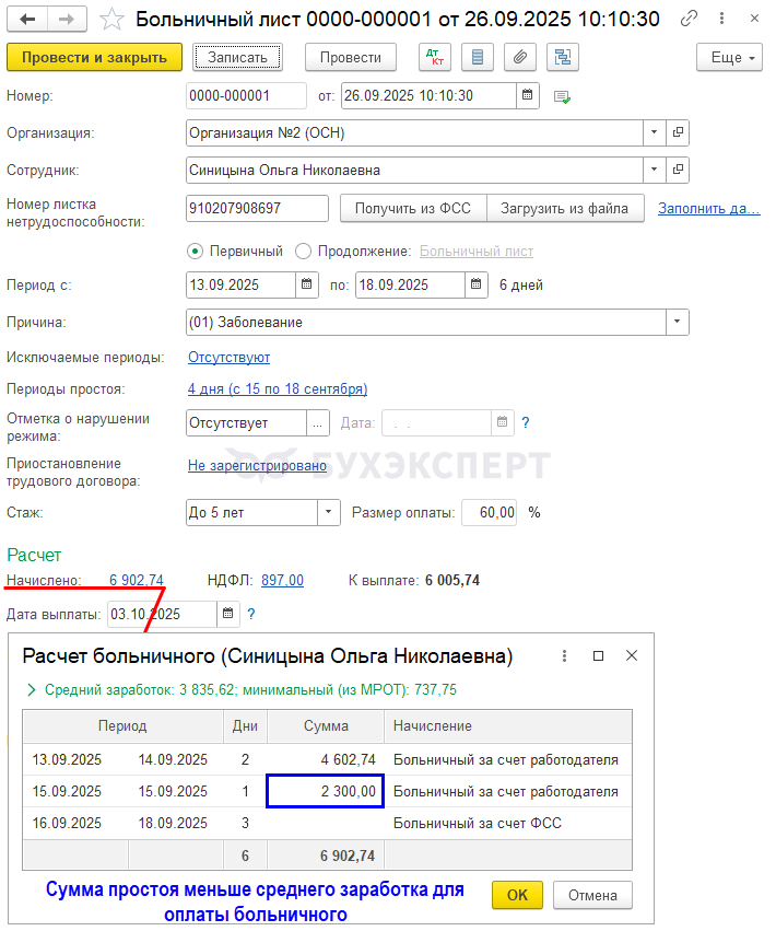 При расчете больничного автоматически определится наименьшая сумма для оплаты больничного за период простоя.