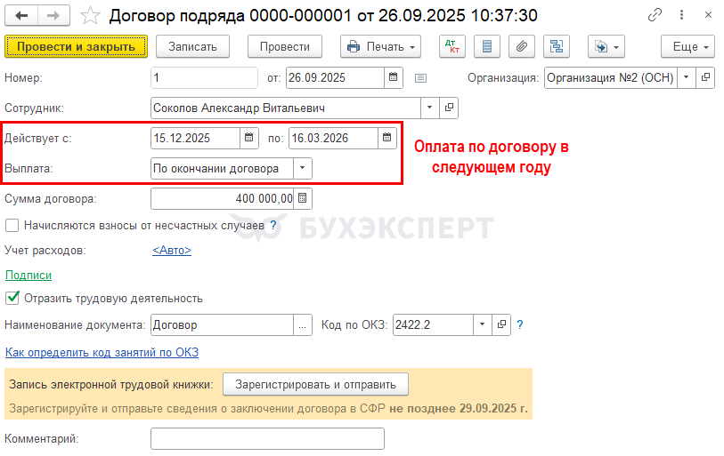 Если работы по договору подряда оплачиваются в следующем году, то в подразделе 1.2 формы ЕФС-1 указывается код НЕОПЛДОГ.