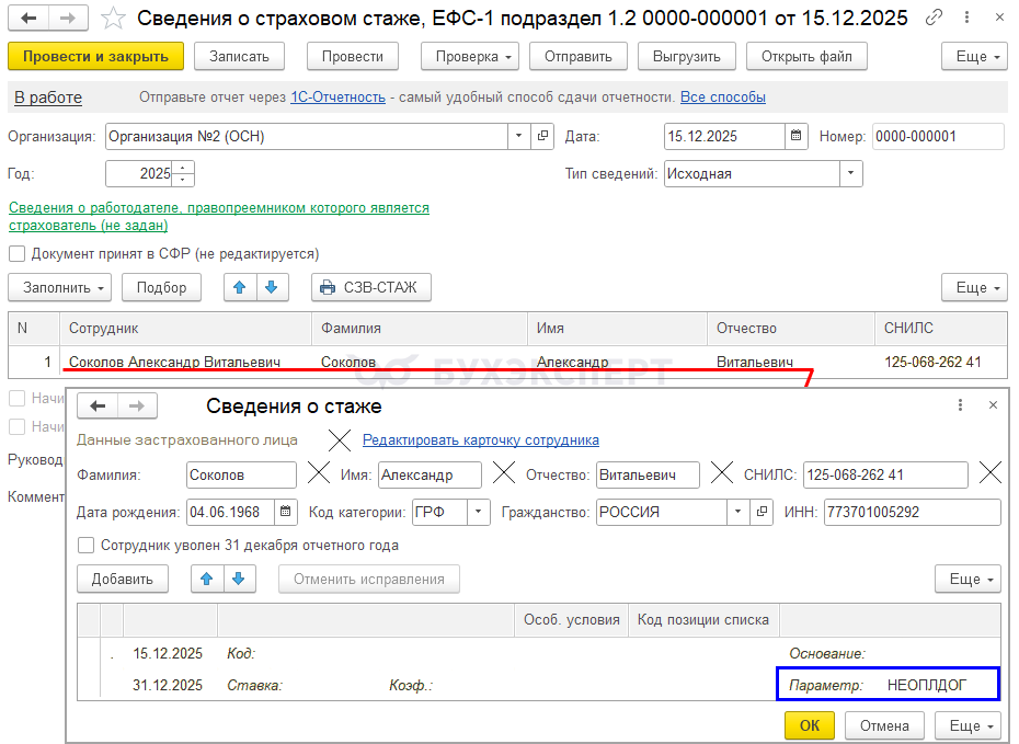 Перейдите в раздел Зарплата и кадры — Страховые взносы — СФР. Пачки, реестры, описи — Создать — Сведения о страховом стаже, ЕФС-1 подраздел 1.2.