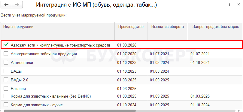Добавьте Автозапчасти и комплектующие транспортных средств в обмен с ГИС МТ «Честный знак» в разделе Администрирование — Интеграция с ИС МП (обувь, одежда, табак) установите флажок Автозапчасти и комплектующие транспортных средств.