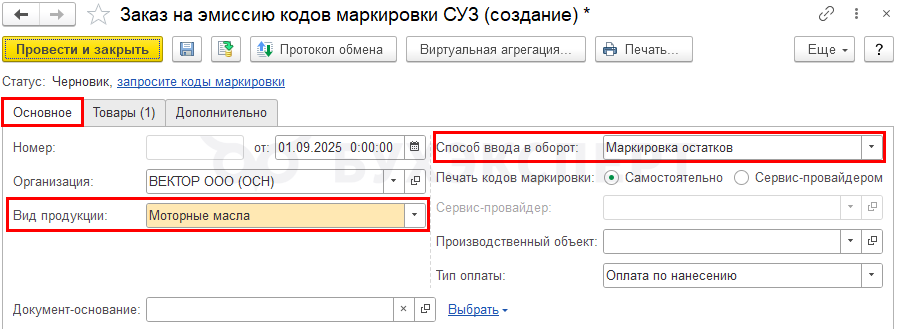 Закажите коды маркировки по остаткам в документе Заказ на эмиссию кодов маркировки СУЗ в разделе Администрирование — Обмен с ИС МП (обувь, одежда, табак) — Заказы на эмиссию кодов маркировки СУЗ.
