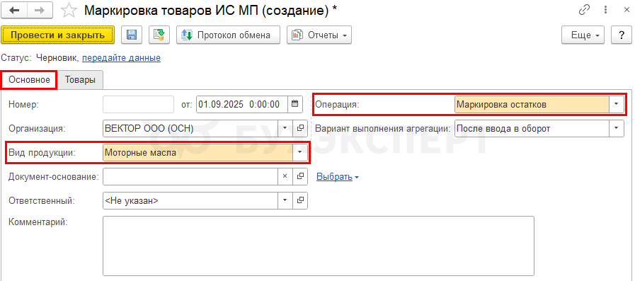 Далее создайте документ Маркировка товаров ИС МП в разделе Администрирование — Обмен с ИС МП (обувь, одежда, табак) и передайте данные в ГИС МТ «Честный знак».