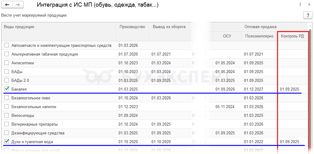 В 1С доступен контроль разрешительной документации по Видам продукции маркировки:
