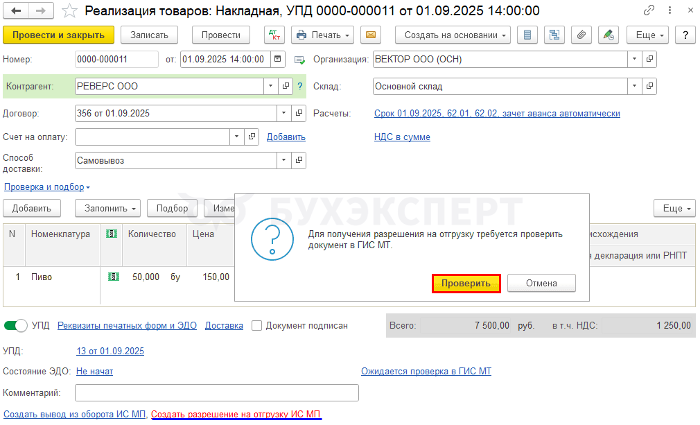 При реализации пивной продукции выполните сначала предварительную проверку в ГИС МТ мест осуществления деятельности (МОД), статусов кодов маркировки и других реквизитов. После перейдите по ссылке Создайте разрешение на отгрузку ИС МП.