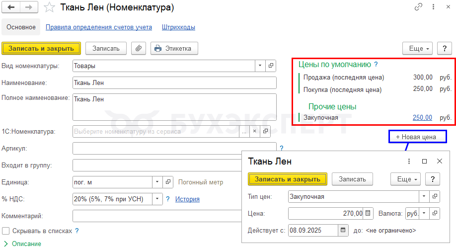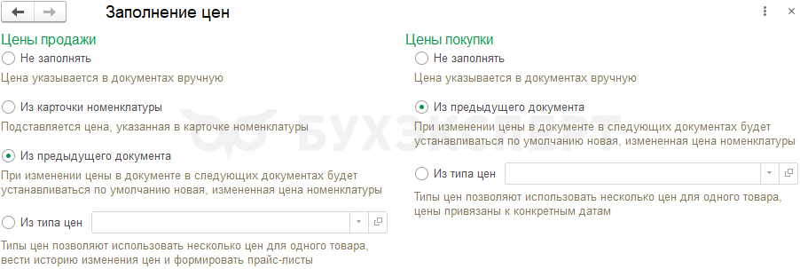 - Заполнение цен продажи и покупки