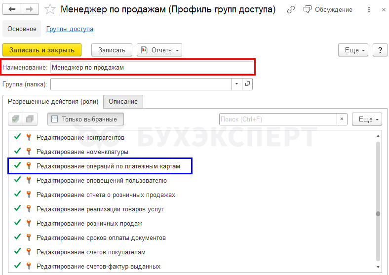 Изменены права доступа в документе Операция по платежной карте. Документ стал доступен для: